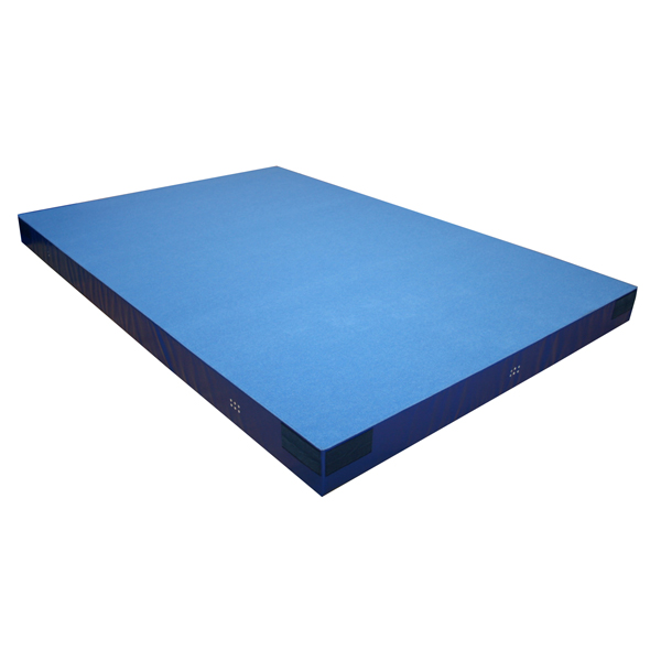 Diese Niedersprungmatte besteht aus einem Sandwichkern mit einer Trittverteilerplatte ud einer zusätzlichen Randstabilität aus Verbundschaum. Die Oberseite der Matte besteht aus einem strapazierfähigen hellblauen Nadelfilz, welcher mit dem Kern verklebt ist und somit eine faltenfreie Oberfläche garantiert. Seitlich ist der Planenstoff mit Lüftungslöchern versehen und die Unterseite besteht aus rutschhemmendem Turnmattenstoff. Die Matte ist mit einer Klett- Flauschverbindung ausgestattet, welche ein nahtloses Aneinanderlegen von Mattenflächen gewährleistet. Bezug – oben: Nadelvlies, seitlich: Planenstoff, unten: Turnmattenstoff Kern: Sandwich – Kern mit Randstabilisierung