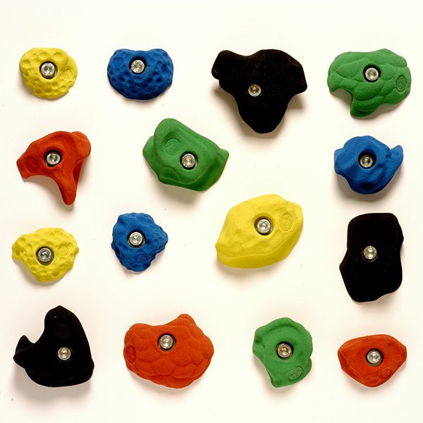 Schulklettergriffset bestehend aus 15 mittelgroßen Klettergriffen (1 XL, 4 L, 5 M, 5 S) und Tritten.