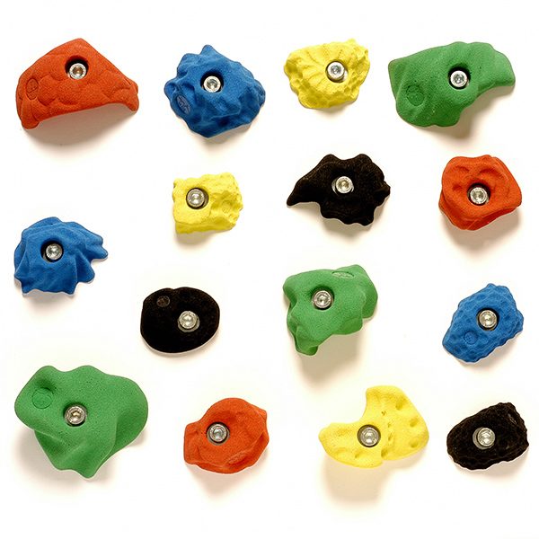 Schulklettergriffset bestehend aus 15 mittelgroßen Klettergriffen (1 XL, 4 L, 5 M, 5 S) und Tritten.